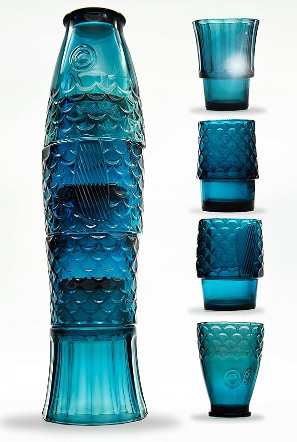 Set of 4 | Handmade Stacking Koi Carp Fish Drinking Glasses | Natural Blue Glass Tumblers