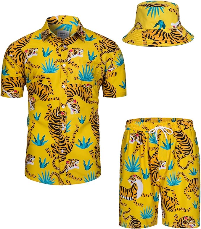 Mens Hawaiian Shirts and Shorts Set 2 Pieces Tropical Outfit Flower Print Button Down Beach Suit with Bucket Hats