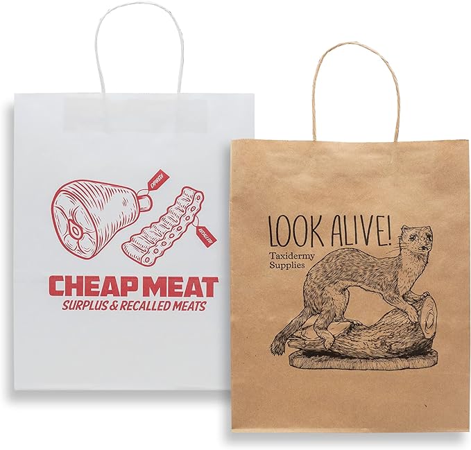 Prank Novelty Gift Bags for Valentine’s Day, 2-Pack: Taxidermy + Cheap Meat, White & Brown Paper Bag, for any Occassion