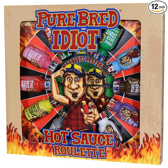 Pure Bred Idiot – Hot Sauce Roulette Game – 12-0.75 Ounce Bottles Hot Sauce Gift Set – Perfect Premium Gourmet Gag Gifts for Men – Spicy Challenge Hot Sauce Sampler
